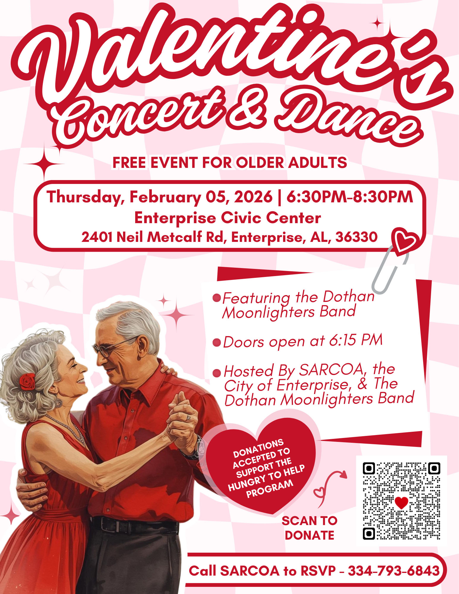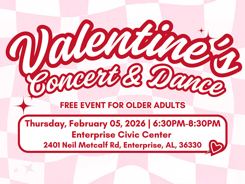 The Valentine’s Concert & Dance is a free event for older adults that brings together music, dancing, and community in a fun and welcoming setting. The event will take place on Thursday, February 5, 2026, from 6:30 to 8:30 PM at the Enterprise Civic Center, with doors opening at 6:15 PM. Entertainment will be provided by the Dothan Moonlighters Band.